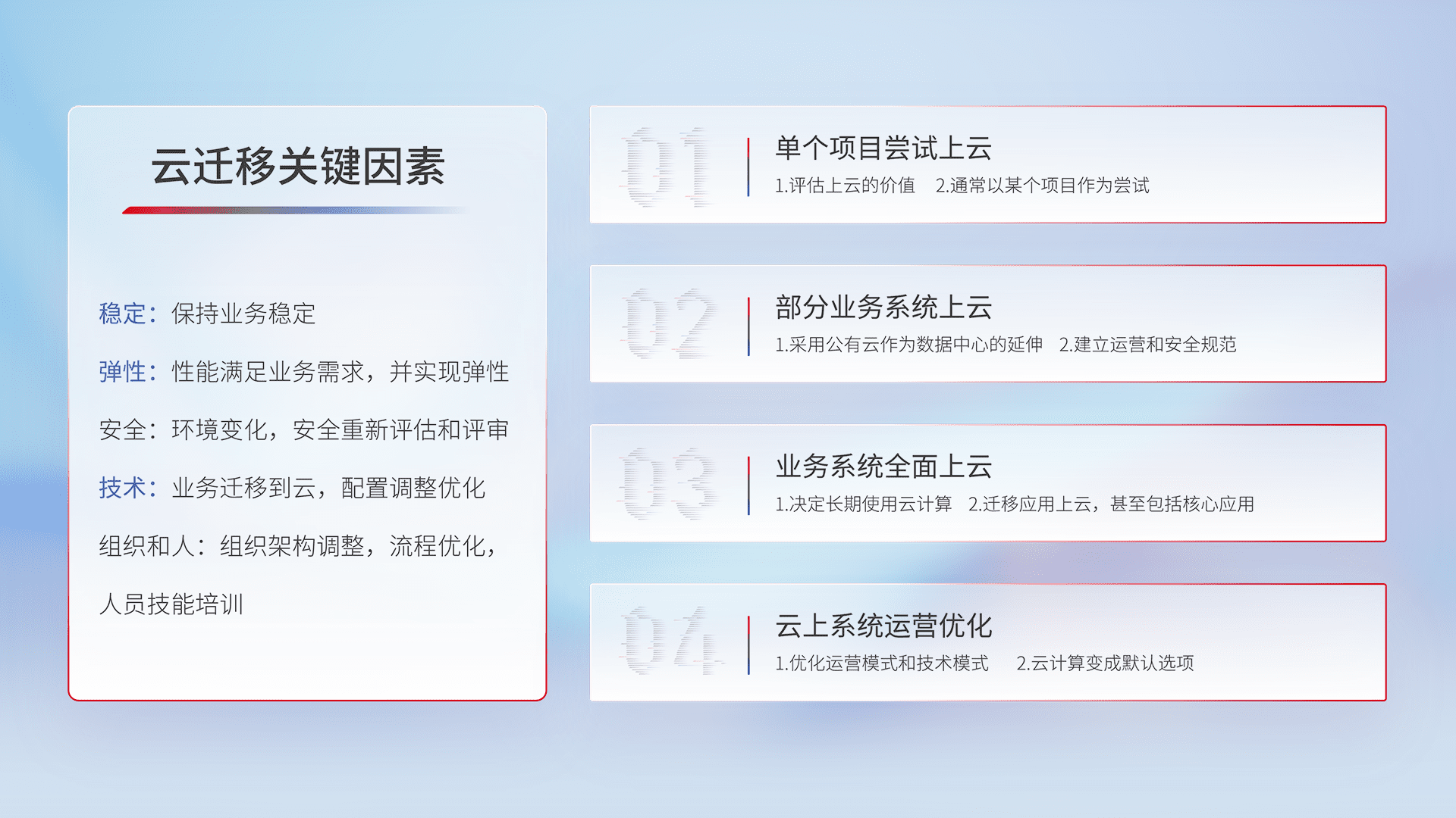 结合实际业务,,从规划设计、、云平台选型、、云原生改造、、、、数据迁移、、、集成交付,,迁移全过程为客户识别最佳上云路径,,,,做好风险识别管理,,,设计网络架构、、、身份权限、、安全审计合规、、、操作审计、、、日志审计、、、监控告警策略、、、、多站点容灾设计等,,,,对云上基础设施进行整体规划,,,提升IT治理水平,,,以满足弹性、、、、高可用、、、高性能的需求。。。。