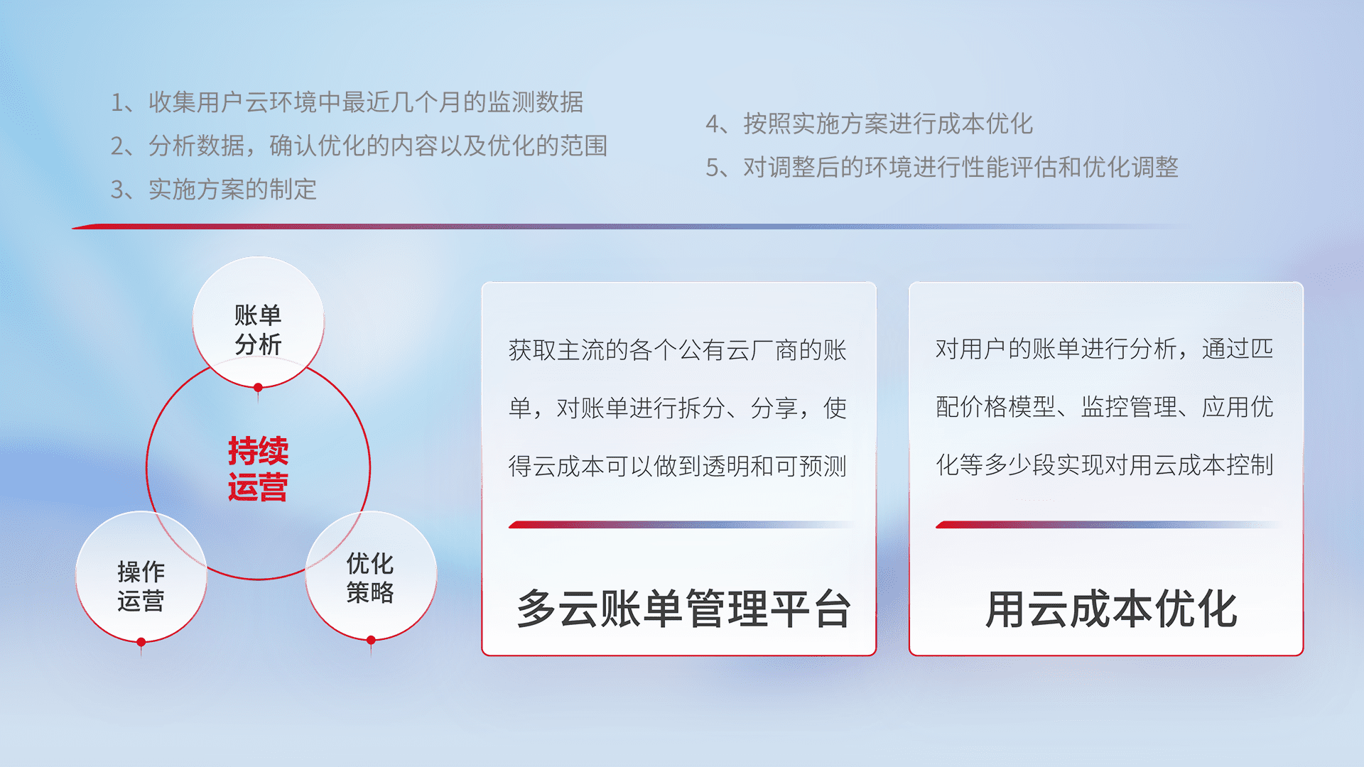通过多云纳管,,,,以统一的资源数据模型把客户的云资源进行抽象和封装,,进而实现对多云资源的统一操作,,,,保障云资源管理的可靠性、、、稳定性与可用性。。。量身定制化运维内容,,,配置、、、开发运维、、、、补丁管理、、备份、、、、监控、、、、认证和访问管理、、审计和日常巡检等,,,,保障在用云过程中的可靠度,,,,稳定度以及高可用率。。。。